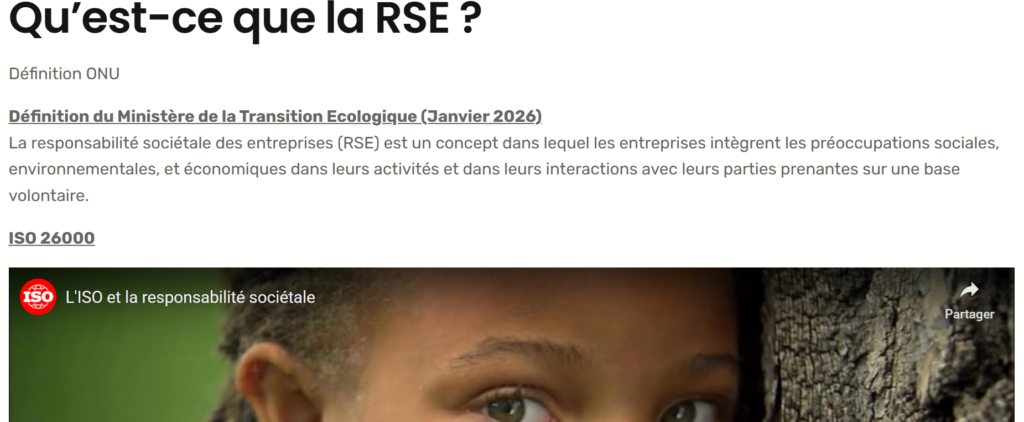 Contenu de la formation : Histoire de la RSE – PRE – PAQ – ISO 26000 – DUER – Respect de l’environnement – Lutte contre les discriminations – Lutte contre les fraudes et la corruption – Protection des données personnelles et de la vie privée. Une partie du contenu de la formation est déjà disponible dans la rubrique Ressources pédagogiques.